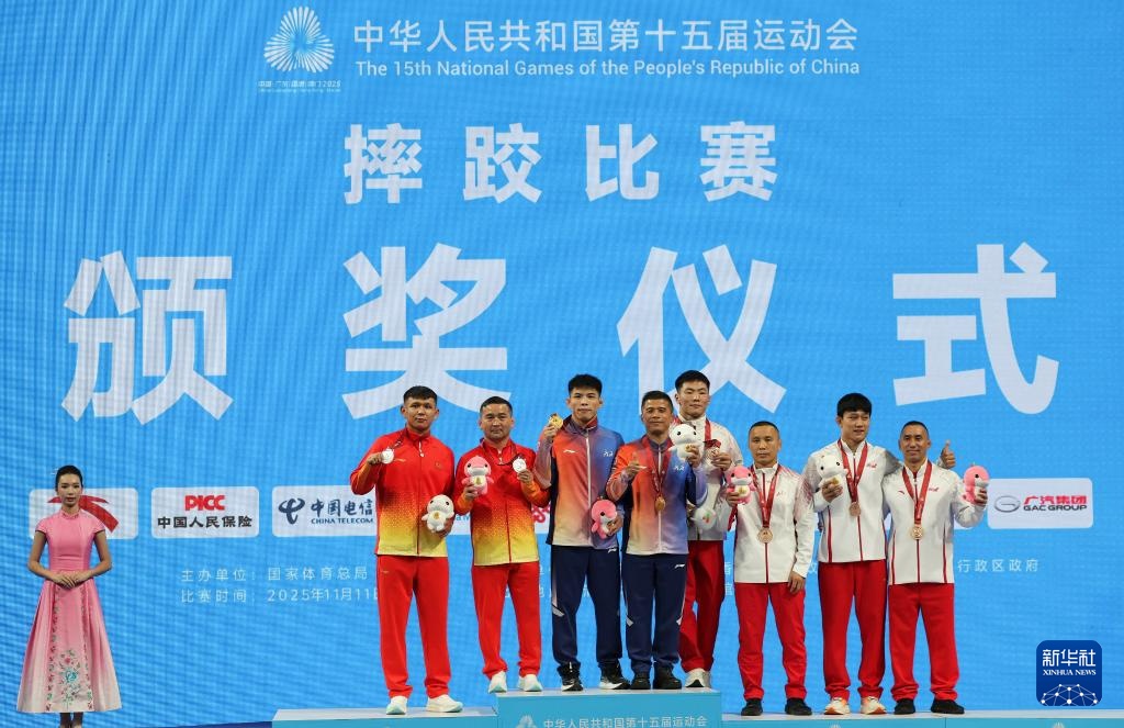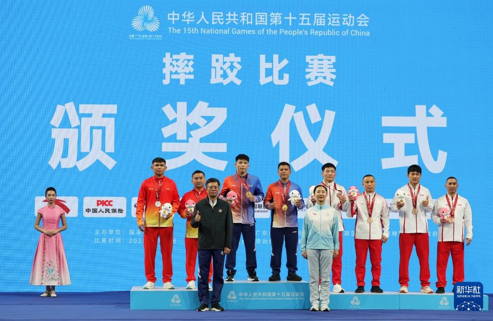 11月11日,获得冠军的广西队选手陆锋(左五),获得亚军的新疆队选手阿黑由·吐尔逊(左二),获得季军的内蒙古队选手巴图青格乐(右四)、云南队选手金文猛(右二)和教练、嘉宾在颁奖仪式上合影。新华社记者 李然 摄